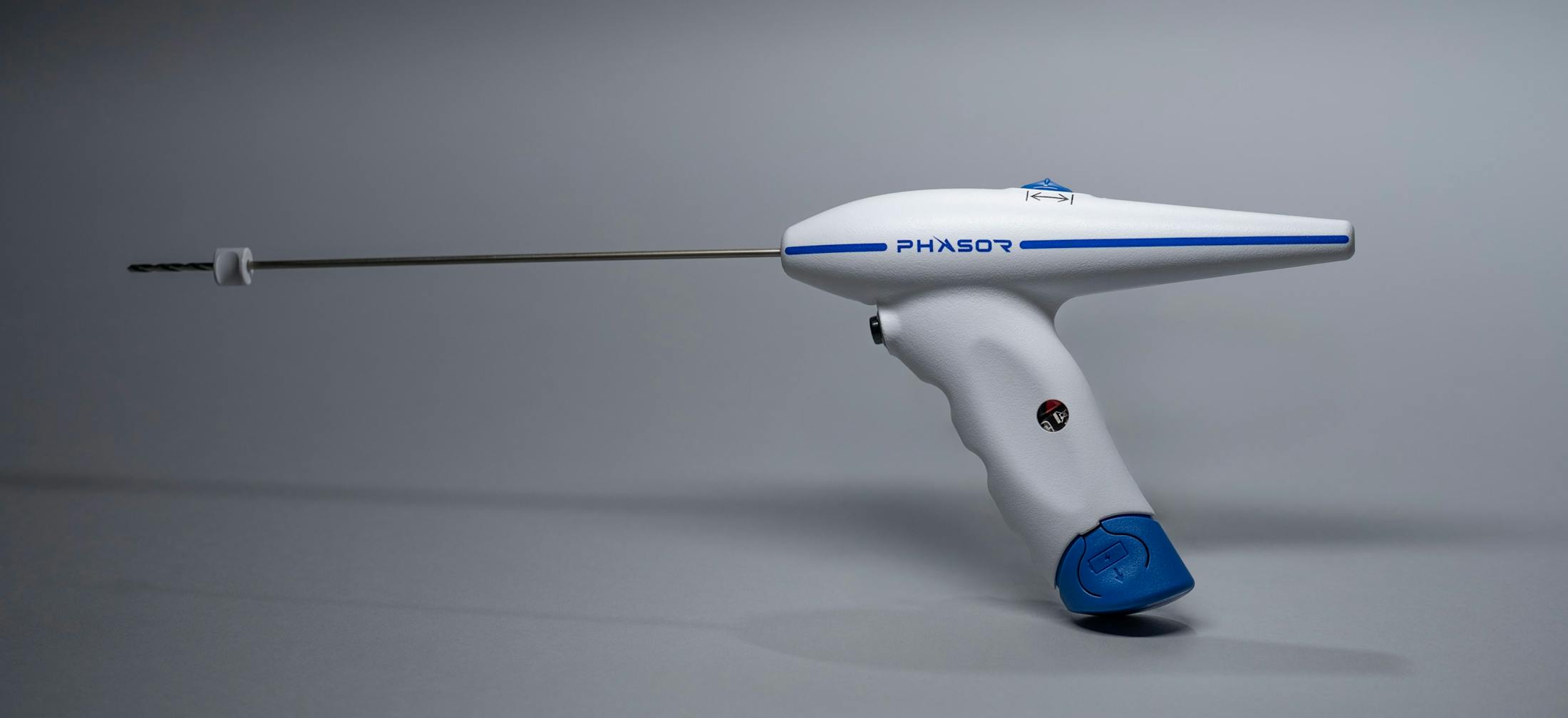 The Phasor Biopsy, LITT, and SEEG Drill Systems are precision-engineered, disposable electric cranial drills designed for neurosurgical applications requiring millimeter-level trajectory control and consistent depth management. Developed for both frame-based and frameless stereotactic systems, each Phasor drill combines lightweight handling with stable torque and tactilin eve feedback, giving surgeons confidence in every use. These powered systems replace bulkier or heavier orthopedic drills often borrowed for neurosurgery -- with our compact, sterile, single-use instruments for precise cranial access, deep brain biopsies, and minimally invasive LASER probe or electrode insertion procedures. Phasor's unique anti-plunge safety system and adjustable depth stop ensure each hole traverses the skull, with added tactile feedback aiding achieving the desired trajectory and minimizing plunging risk.